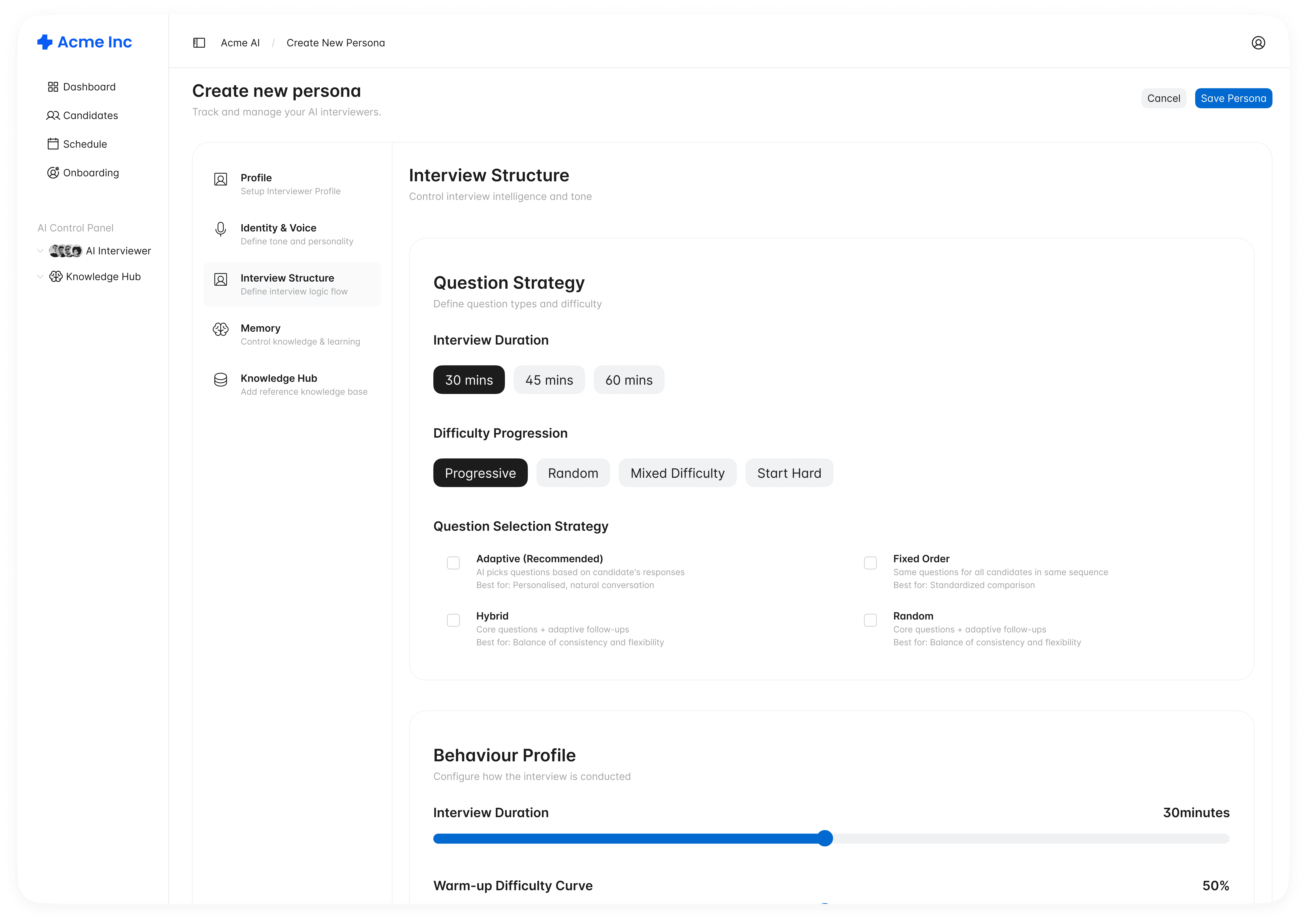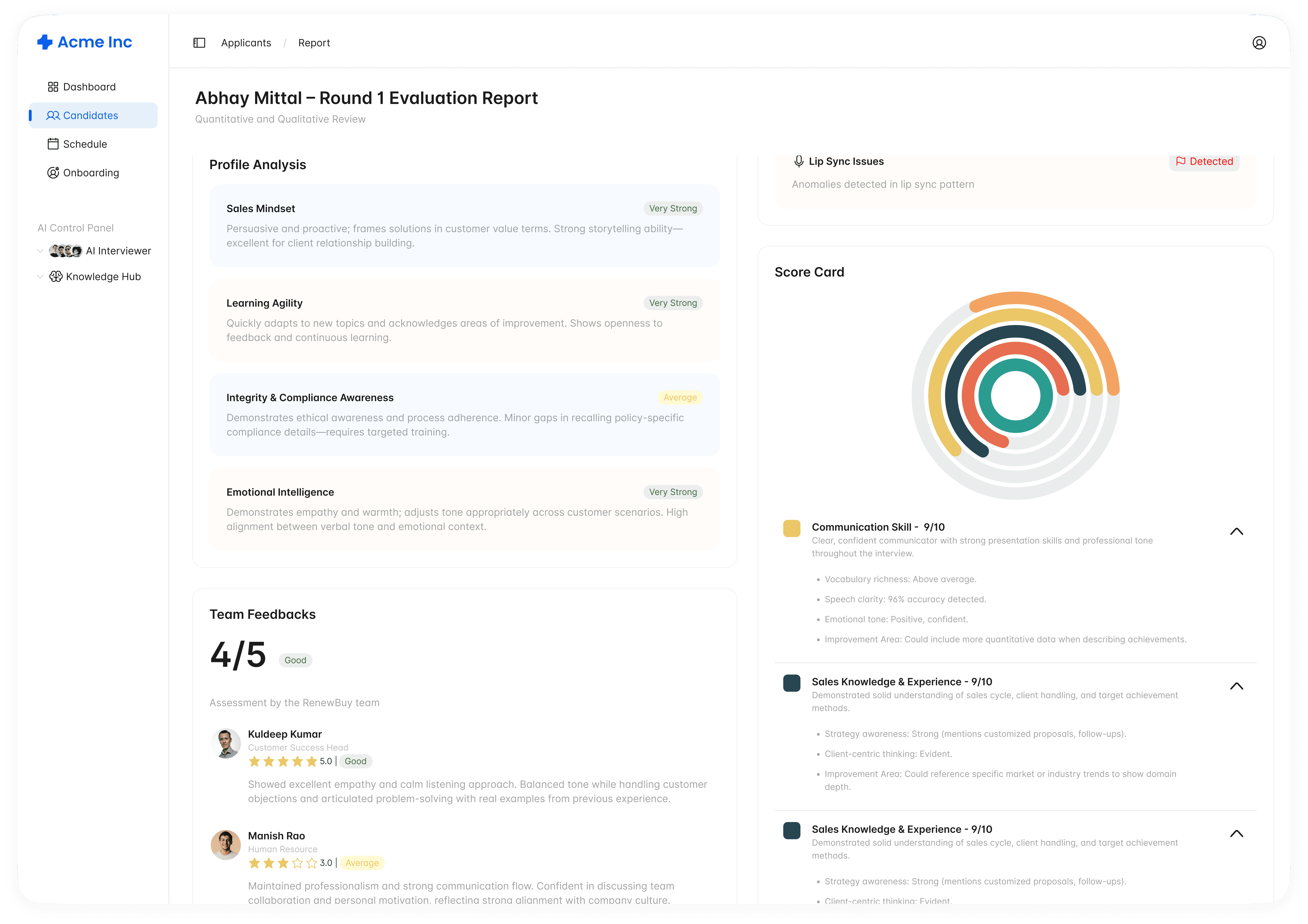 AI-led technical interviews assess candidate proficiency with targeted questions.
