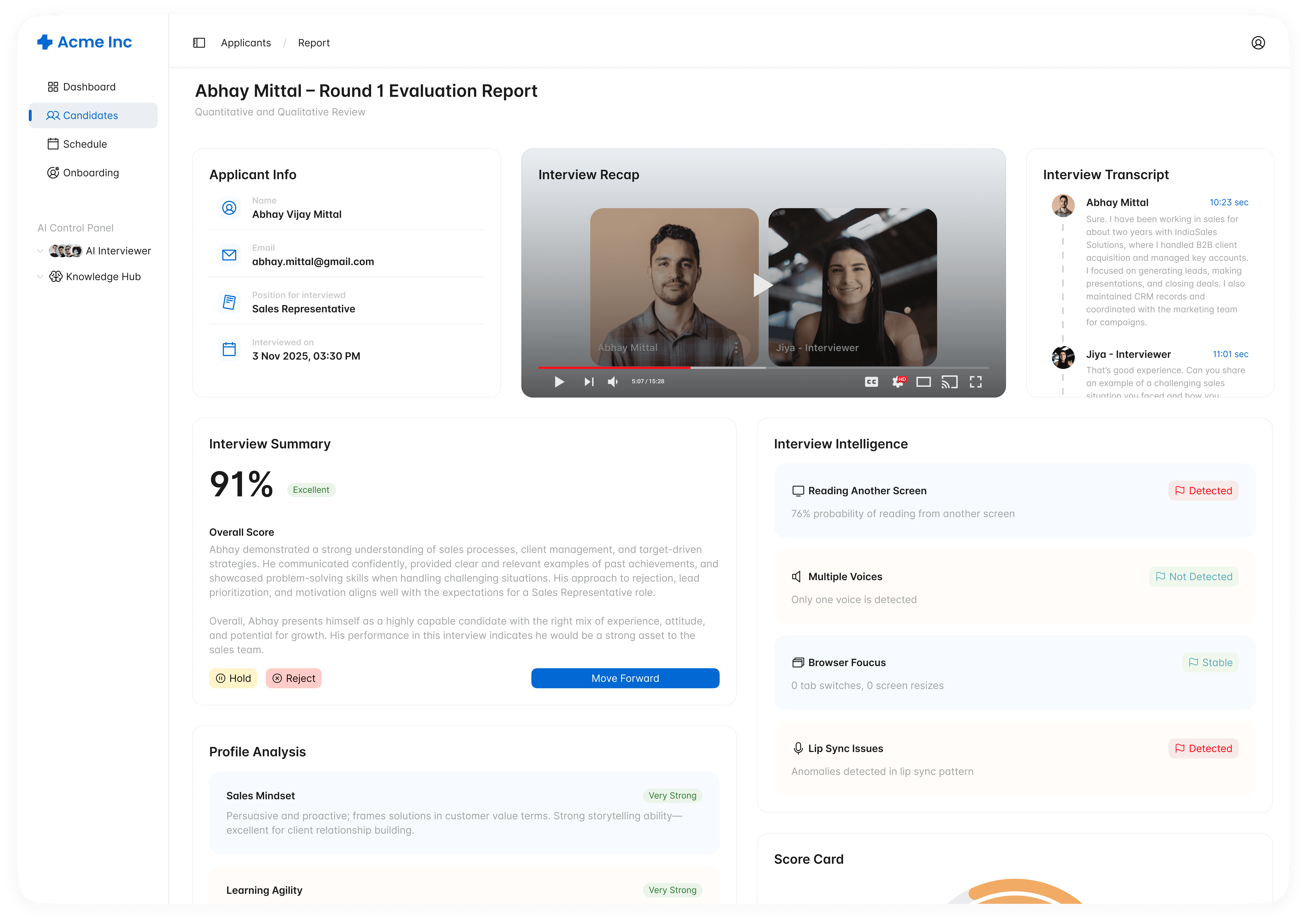 Gemma is your AI Interviewer built to evaluate, not just filter. Conducts interviews, designs assessments, and ranks candidates across multiple performance and behavioral parameters. Once a candidate clears her evaluation, she crafts a personalized onboarding journey for them